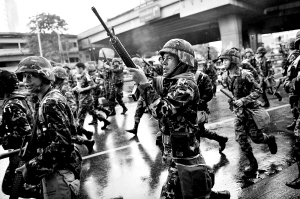 | 4月13日,泰国士兵在首都曼谷向天空鸣枪示警以驱散示威者。这是泰国政府12日宣布在曼谷及周边地区实施紧急状态后,被称为“红衫军”的反政府示威者与军警之间爆发的第一场正面冲突。