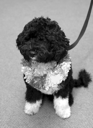 4月12日,美国总统奥巴马(左二)和家人欢迎一只刚抵达华盛顿白宫的6个月大的葡萄牙水犬。这只黑白两色的宠物狗是马萨诸塞州参议员泰德·肯尼迪作为礼物赠送给“第一家庭”的。 新华社/法新