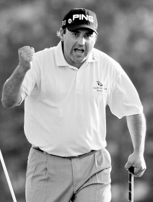 4月13日,美国高尔夫球大师赛在奥古斯塔国家高尔夫俱乐部收杆,阿根廷选手卡布雷拉以276杆的总成绩夺得冠军,世界头号球手“老虎”伍兹仅获得并列第六名。图为卡布雷拉庆祝胜利。 新华社发