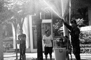 | 14日,曼谷街头一名军人向过往行人洒水庆贺。 新华社发 |