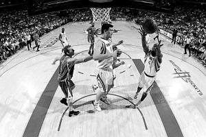 4月14日,火箭以86:66大胜黄蜂,排名升到西部第三。姚明打了31分钟,13投8中,拿下22分7个篮板,图为姚明(中)和队友兰德里强攻篮下。 小新发