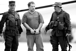 | 4月15日,哥伦比亚警察在首都波哥大的一个军用机场押送毒枭“堂马里奥”(中)。 新华社/路透 |