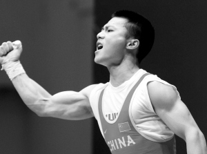 | 4月16日,第十一届全运会男子举重赛暨全国男子举重锦标赛在椰城开赛。图为夺得总成绩第一和挺举第一的湖南队选手陶劲欢呼胜利。 本报记者 宋国强 摄 |