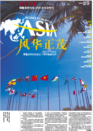 2006年 2006年博鳌亚洲论坛年会开幕当天,海南日报推出特刊“风华正茂———博鳌亚洲论坛成立5周年隆重志庆”。介绍了博鳌亚洲论坛从成立以来5年的发展历程。论坛以“亚洲寻求共赢”为使命,介绍每年年会新主题—— 2002年:新世纪、新挑战、新亚洲———亚洲经济合作与发展;2003年:合作促进发展;2004年:一个向世界开放的亚洲;2005年:亚洲的新角色;2006年:亚洲的新机会。以及介绍海南与博鳌开放演绎精彩、博鳌走向未来等8块版面展示博鳌亚洲论坛。 ← →
