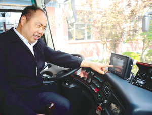4月16日,一辆被改装为纯电动车的尼奥普兰大型客车在北京亮相。这辆55座纯电动大巴在行李舱内安装了由曹青山研发的两排蓄电池组,充电1次客车可行驶600公里以上,最高时速可达120公里。两排蓄电池组重约2吨,充放电次数可达1000次以上,寿命可达50万公里。图为保康青山能源研究所所长曹青山在介绍驾驶员席用来监测电池情况的仪表。 新华社记者王建华摄