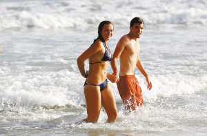 | 在三亚大东海,两位外国游客在海中漫步。