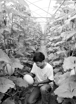 | 凤凰镇槟榔村设施农业基地,农民在检查哈密瓜的长势。 本报记者 李英挺 摄 |