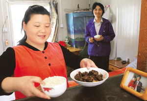4月19日,王莉(左)在为农民工丈夫徐祥(右)准备饭菜。 正在参加上海洋山深水港建设的安徽申巢力源有限公司,在建筑工地附近为已婚农民工搭起20多间“夫妻房”,不仅减轻了农民工在外租房的负担,还让他们在遥远的异乡感受到“家”的感觉。 新华社发