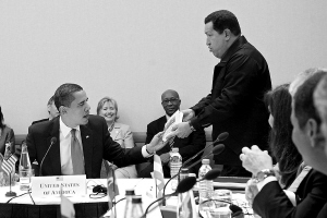 4月18日,在特立尼达和多巴哥首都西班牙港,委内瑞拉总统查韦斯(右)在第五届美洲国家首脑会议的一次多边会议前向美国总统奥巴马赠送乌拉圭作家爱德华多·加莱亚诺用西班牙文写的名著《拉丁美洲:被切开的血管》。 新华社/法新