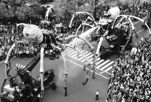 4月19日,一家法国公司制作的高12米、重37吨的巨型机械蜘蛛在日本港口城市横滨街头表演,庆祝横滨开港150周年。 新华社/路透