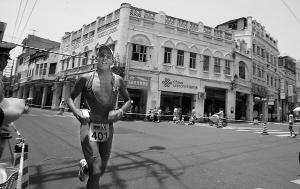 | 图为参赛运动员穿越海口老城区时受到市民热烈欢迎。 本报记者古月摄 |