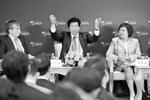 面对金融危机,企业如何作战略布局?中国远洋运输集团总裁魏家福(中)认为,应对金融危机企业有三种选择:即冬眠、冬泳、冬训。