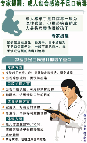 河南省疾控中心副主任许汴利介绍,手足口病是婴儿和儿童的一种常见疾病。这个病最高的发病季节在4月到7月之间,临床上这个病很常见:口腔里面可以看到有红色的小孢子,手掌心,还有臀部有一些小疱疹,它不痛、不痒、不结痂、不留痕迹,这种病的病程是4到7天。手足口病有中度传染性。人与人之间的传染是通过直接接触感染者的鼻和咽分泌物或粪便。在发病的第一周传染性最强。手足口病不会在人和动物或宠物间传播。
