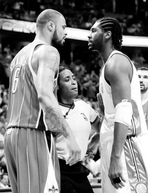 4月22日,在NBA季后赛中,丹佛掘金队以108比93战胜新奥尔良黄蜂队。图为黄蜂队球员钱德勒(左)被吹犯规后与掘金队球员内内争执。 新华社发