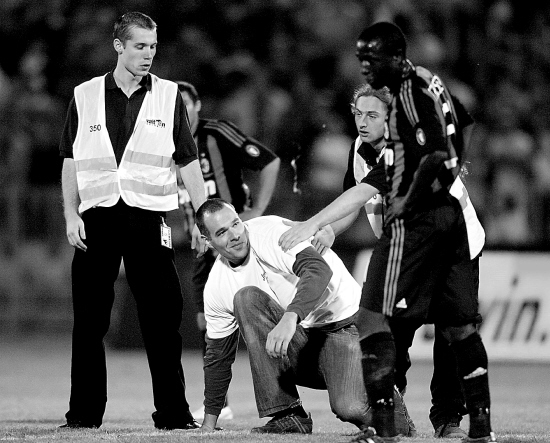 4月22日,在匈牙利布达佩斯举行的一场国际友谊赛中,AC米兰队以5比2战胜匈牙利联队。图为一名冲入场中的球迷(中)被安保人员抓住。 新华社发