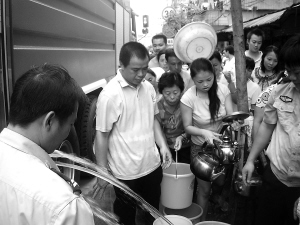 | 消防车为道客新村居民送水。 本报记者 林伟 摄