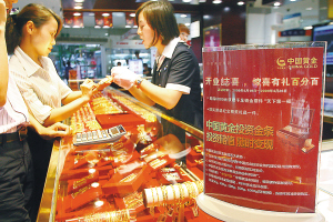 国内颇具代表性的实物黄金投资产品———中国黄金投资金条,4月23日在海口明珠广场黄金专柜开市交易。据悉,与其他黄金相比,中国黄金投资金条具有实时金价、双向买卖、随时变现等极具竞争力的交易方式。图为市民在专柜选购投资黄金现货。 本报记者 古月 摄
