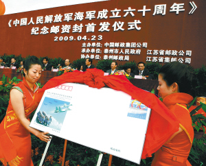 人民海军成立60周年 纪念邮资封首发 4月23日,在位于江苏省泰州市白马镇的中国人民解放军海军诞生地纪念馆,中国邮政集团公司举行《中国人民解放军海军成立六十周年》纪念邮资封首发仪式。 新华社发
