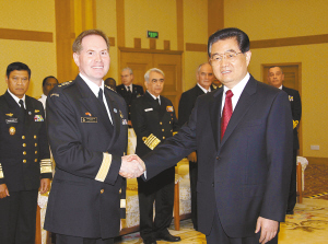 | 4月23日上午,国家主席、中央军委主席胡锦涛在青岛会见应邀前来参加中国人民解放军海军成立60周年庆典活动的29国海军代表团团长,代表中国政府和军队向参加庆典活动的各国海军官兵表示热烈欢迎。新华社记者王建民摄 |
