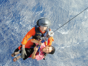 随后,救生员杨建辉选择合适时机跃出机舱,下降至施救渔船上。杨建辉简单地了解了被救渔民的情况,发现其胃部疼痛难忍但神智尚清醒,考虑到其发病部位靠近“单套”救援方式的施套部位,为了避免救援套加剧病人的疼痛,杨建辉与机组协商决定采用“双套”方式救援。