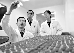 →由第三军医大学教授邹全明领衔团队历时15年研制的“口服重组幽门螺杆菌疫苗”(简称Hp疫苗),日前获国家食品药品监督管理局批准颁发的国家一类新药证书。这是迄今为止世界上首个Hp疫苗,标志着我国在预防幽门螺杆菌感染及相关胃病研究领域跃居国际领先水平。这是科研人员在查看疫苗。 新华社发