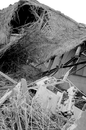 | 服装厂坍塌的车间内被砸坏的缝纫机设备。
