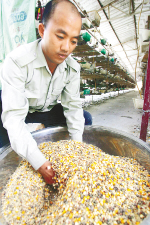 | 在昌江昌化镇大风村鸽子养殖场,钟香伟正在搅拌饲料。