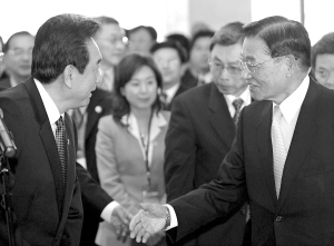 4月25日,海协会会长陈云林与台湾海基会董事长江丙坤互致问候。新华社发