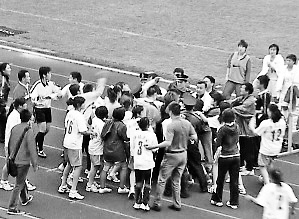 终场哨声一响,看台上的新疆二队队员就冲下看台,被罚出场的高桂媚也再度出马,与场上的球员共30多人一起围攻边裁。