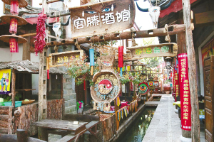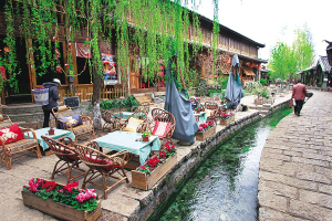 古城心灵的柔软就显示在这种包容度上。它容纳着各色人等,也容纳着各色人等的各色欲望。古城里游客摩肩接踵,带着艳羡的目光,走着走着,他们中也许就有一人停下来,成了常居古城的人。来自不同地域定居的人们,把自己的才华、梦想,展示在古城沿街的铺面上,每一家铺面的装潢都别具一格,店里的桌椅、灯具、餐具或者出售的各种布的、木的、藤的、草编的手工艺品,色彩浓烈却不俗艳,也许是古城厚重的历史,要靠这些浓墨重彩出场,才能压得阵脚吧。
