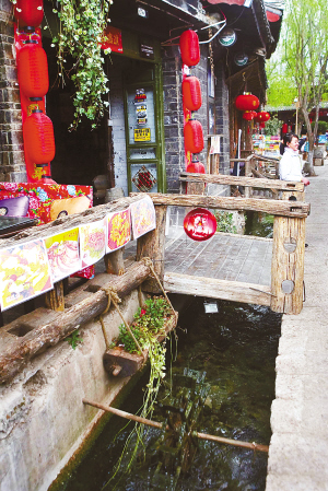 束河给我的感觉,便如同这位老人,上了年纪,却依然有着明净纯真的心性。所以,束河的街道一尘不染,束河的流水清得像山泉的源头,束河的人看上去有些不食人间烟火。逐水而居,是人类最早的天性,束河人家几乎家家傍河,因为是融雪汇成,河水温度很低。于是,束河人用竹筐等器具装了啤酒、可乐等,浸在水中,啤酒、可乐便有了天然的“冰箱”,很环保很节能也很率真,成了束河一景。街边卖水果的老人,也用盆盛了河水,将水果浸在其中向游客兜售,吃来冰凉解渴。