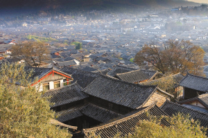 空中所见的丽江,拥有最为古典的城市屋顶。没有高楼,屋顶一般齐,翘角飞檐上,清一色的黑瓦,鳞片般,把丽江覆盖成一尾阳光下的鱼,灵动、自在、缄默,大气地游行在云贵高原上。丽江作为世界文化遗产,由大研古城、束河古镇、白沙古村落组成,我们仅去了前两个。