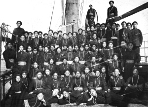 | 1885年前后,山东威海卫,在战舰上合影的水兵。1874年,李鸿章上奏组建北洋水师,主力战舰悉从国外购进,军事教官也大多从国外聘请。