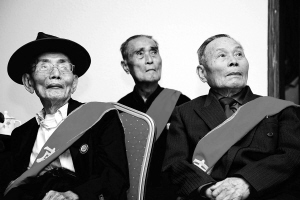 | 纪念海南南侨机工回国抗日七十周年大会上,年过九旬的琼籍南侨机工翁家贵(右)、吴惠民(中)和谢章农(左)难得聚首。 海南日报记者 李幸璜 摄 |
