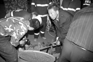 4月25日,救援人员搜救失踪的工人。 当日下午4点30分许,河北省邯郸市几名清淤工在该市铁西北大街主污水管道进行清掏作业时,一名作业工人不慎被困深约8米的井下,在自救过程中两名工人又被困井下。事故发生后,当地消防特勤人员迅速展开营救工作,傍晚又从邯郸一煤矿调来一支救护队配合搜救。最终,两名工人被救出并送往附近医院救治,尚有一名工人失踪。截至26日发稿时,寻找救助工作还在进行中。 新华社发