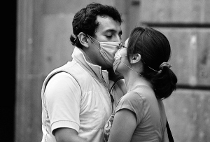 4月25日,在墨西哥首都墨西哥城,一对情侣戴着口罩接吻。墨西哥卫生部官员何塞·科尔多瓦当日通报说,截至24日晚间,墨西哥共有20人直接因感染猪流感病毒死亡,全国疑似病例达4000余人。 新华社/法新