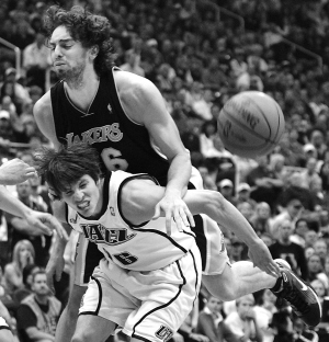25日,NBA季后赛首轮比赛中,湖人队客场胜爵士队。 图为湖人队加索尔(上)与爵士队科沃尔冲撞在一起。 新华社发