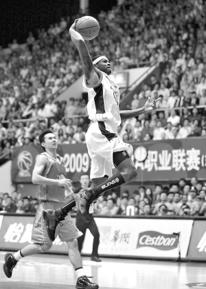 26日,在CBA总决赛第二场比赛中,广东队主场以100比81战胜新疆。图为广东队帕克(上)在比赛中扣篮。 新华社发