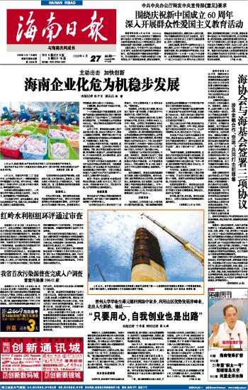 海南日报 头版 001 2009-04-271 2009年04月27日 星期一