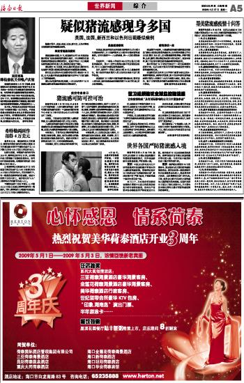 海南日报 世界新闻 综 合 005 2009-04-271 2009年04月27日 星期一