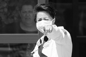 4月27日,在西班牙阿尔曼萨的一家医院,一名保安人员戴着口罩。西班牙卫生部27日确认该国第一例人感染猪流感病例。这名23岁的患者目前在阿尔曼萨的这家医院接受治疗。 新华社/法新