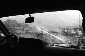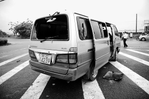 本报嘉积4月27日电 (特约记者蒙钟德 摄影报道)今天下午,琼海市交通局交管人员在嘉积镇温泉万石高速路口设卡查处非法黑车时,突然遭到十五六名不明身份的年轻男子的袭击,执法人员中五人不同程度受伤,一辆执法面包车车窗玻璃被砸烂。 记者赶到现场时看到,打砸现场还遗留有数根木棍、铁棍,车里车外到处都是车窗玻璃碎片。目前,警方已介入调查。