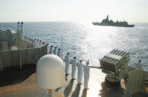 | ←4月26日上午,圆满完成第一阶段护航任务的海军首批护航编队“武汉”舰和“海口”舰驶入南海海域。 新华社发 |