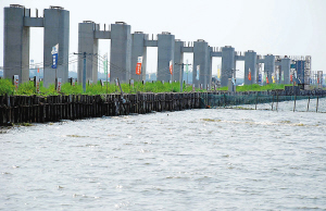 正在建设中的京沪高速铁路丹昆特大桥纵贯江苏省东部,桥段七次跨越阳澄湖,总长5.9公里,采用“双排桩筑坝围堰”施工方案,将水上施工改为陆地施工,把湖区桥梁施工对环境的影响降到了最低。 新华社发