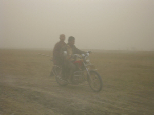 4月28日,新疆阿拉尔市农民冒着沙尘乘坐摩托车回家。当日,新疆南部塔里木盆地大部遭遇大风沙尘天气,部分区域能见度不足10米。 新华社记者 贺占军 摄