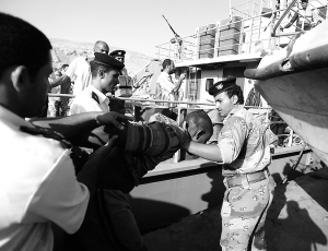 4月27日,在也门东南部港口穆卡拉,也门海军人员将拘捕的索马里海盗从军舰上押上岸。当天,也门海军特种部队成功解救了一艘在也门南部海域遭索马里海盗劫持的小型油轮,至少2名海盗在交火中被击毙,其余11名海盗被抓获。 新华社/路透