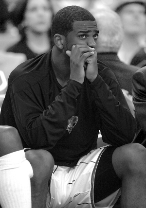 | 4月28日,NBA季后赛首轮第四回合比赛中,新奥尔良黄蜂队主场以63比121不敌丹佛掘金队,“追平”了NBA联赛半个多世纪以来季后赛输球最惨纪录。图为黄蜂队核心保罗坐在场边神情发呆。