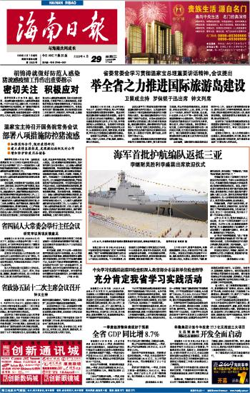 海南日报 头版 001 2009-04-291 2009年04月29日 星期三