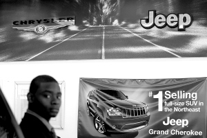 | 4月24日,一名销售人员站在美国纽约的一家克莱斯勒汽车经销店内。