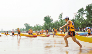 5月3日上午9时,我省五四青年杯RTM皮划艇联谊赛开赛,来自全省高校及企事业单位的14支代表队、168名运动员参加了比赛。本次大赛是共青团海口市委和海南环华户外俱乐部为纪念五四运动90周年而举办的。图为参赛运动员携艇下水时的情形。 本报记者 王军 摄